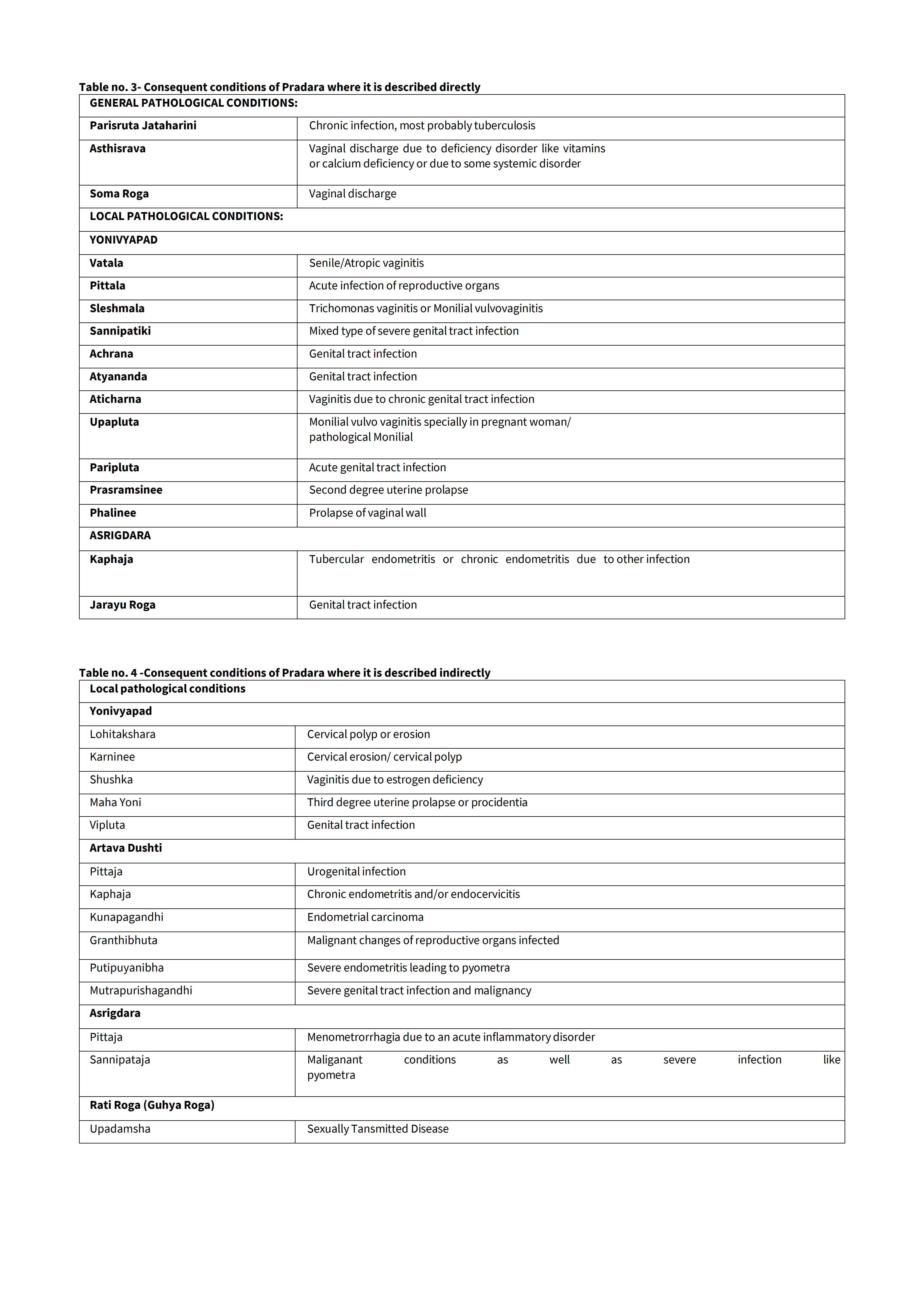Various general & local pathological conditions described as a causative factor of abnormal discharge in modern science are mentioned here as yonivyapada. Out of them, in some conditions Yonisrava described directly as a symptom and others conditions.